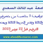 جامعة محمد الخامس – الرباط: مباريات توظيف 4 متصرفين د2، 1 متصرف د3 و1 تقني د3. الترشيح قبل 20، 22، 26، 27، 30 نونبر و01 دجنبر 2025
