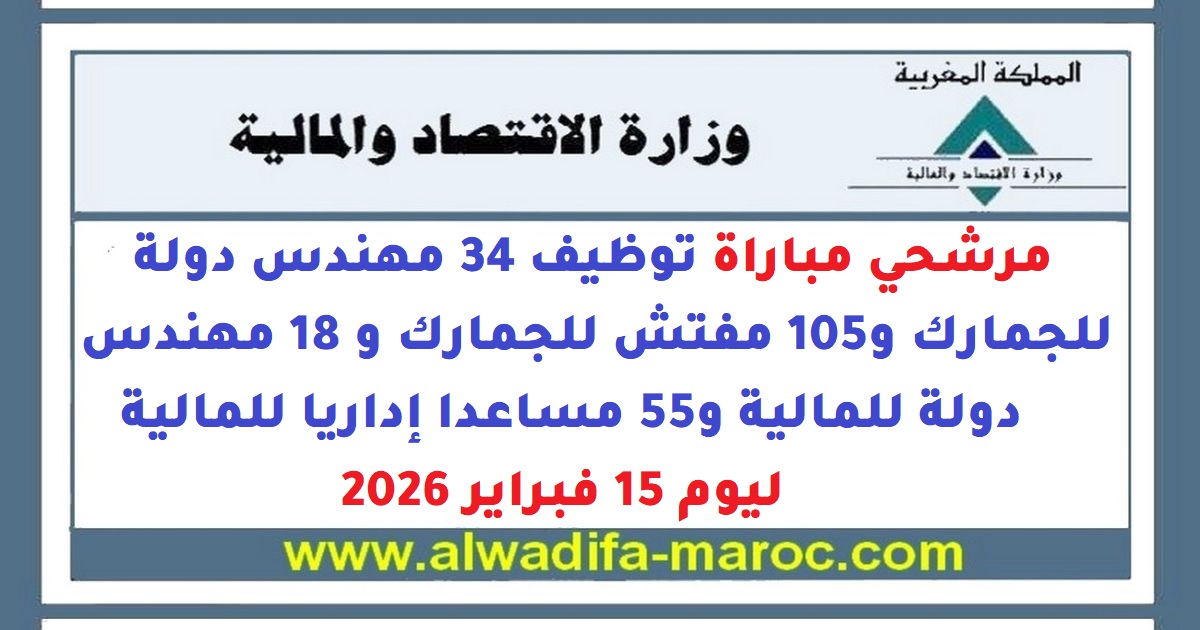 مرشحي مباراة 34 مهندس دولة للجمارك و105 مفتش للجمارك و 18 مهندس دولة للمالية و55 مساعدا إداريا للمالية ليوم 15 فبراير 2026